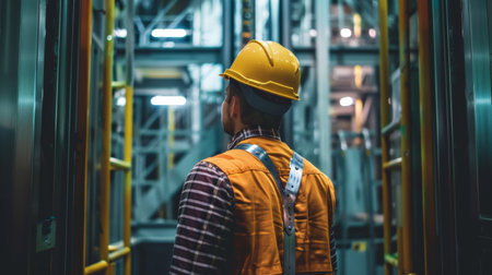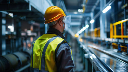 Safety engineer in industrial facility, wearing helmet and reflective vest, overseeing operations in a manufacturing environment.