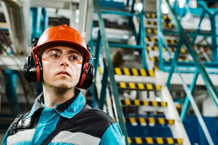 Portrait worker man with yellow helmet and ear protection in factory, Dark tone