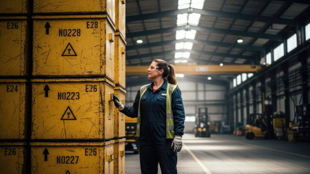 A warehouse worker inspects a stack of yellow boxes in a large industrial setting. The scene features artificial lighting and a high-angle perspective. The color palette includes yellows, blues, and grays. This image could be used for logistics, storage, or supply chain concepts.