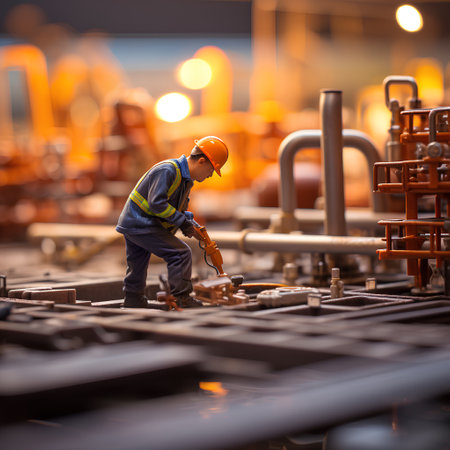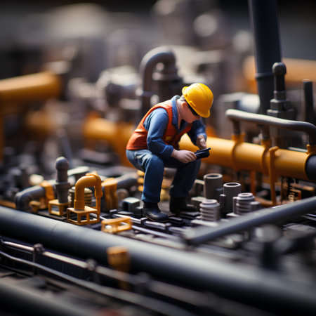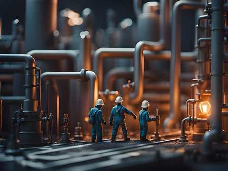 Miniature workers performing maintenance on industrial pipeline