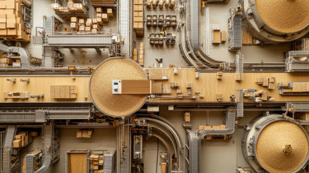 High-angle view of an industrial warehouse showcasing intricate machinery and organized storage, highlighting efficiency in modern logistics and distribution processes.