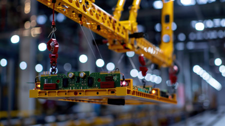 An industrial crane skillfully maneuvers circuit boards within a modern manufacturing facility, showcasing advanced technology and precision in production processes.