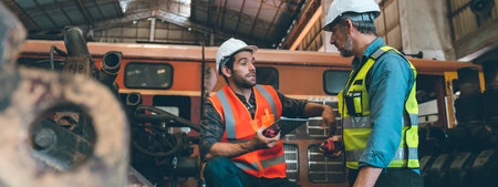 Engineering people are working in heavy industrial plant Engine parts factory .