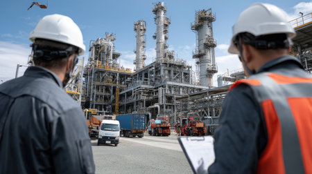 Two industrial workers in safety gear observe a complex facility, highlighting teamwork and engineering within a busy operational environment.