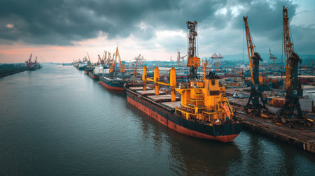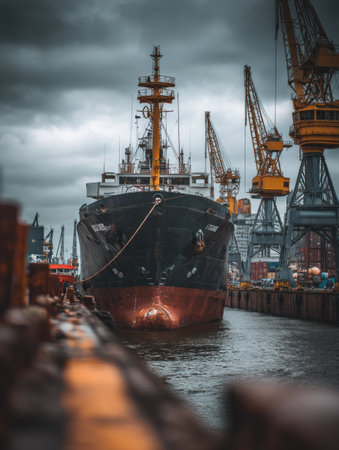 A striking image of a large container ship docked in a busy harbor, surrounded by towering cranes against a moody sky, illustrating the critical operations of maritime logistics.