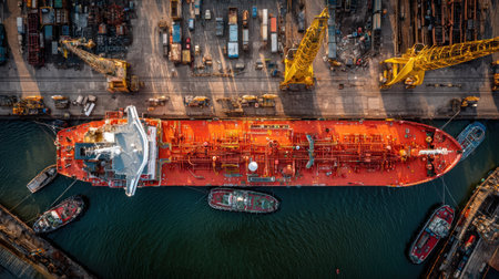 An overhead perspective reveals a large red cargo ship docked at a bustling port. The image showcases a network of boats, containers, and cranes against a backdrop of dark water. The lighting is natural, casting shadows across the scene. The composition is suitable for illustrating shipping and global trade concepts.