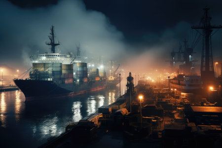 A tranquil harbor scene featuring a cargo ship docked amidst fog, illuminated by soft streetlights, creating an atmospheric and mysterious evening landscape.