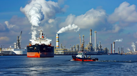 Ships navigate a misty harbor at dawn, surrounded by towering factories emitting smoke, reflecting the industrial activity of the area.