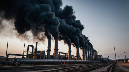 Industrial complex silhouette with tall chimneys releasing thick plumes of dark smoke into an overcast sky, symbolizing environmental pollution and the impact of human industry