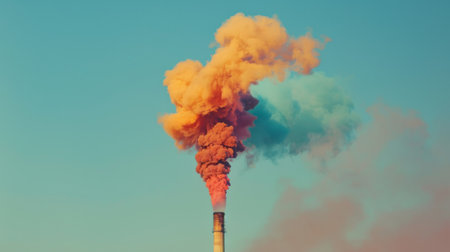 Brightly colored smoke plumes rising from a smokestack against a clear blue sky, highlighting environmental concerns.
