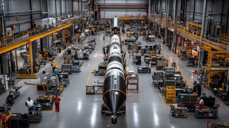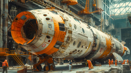 Rocket preparation in a spacious workshop at a space facility during daylight hours