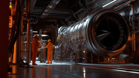 A captivating view of a modern industrial facility featuring large turbines and advanced machinery in a well-structured environment emphasizing technology and engineering.