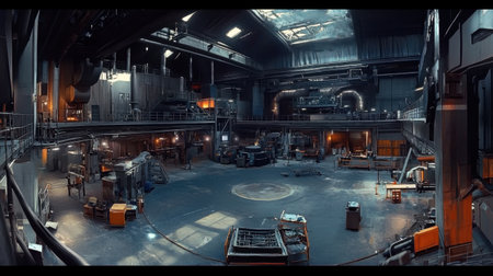 An interior perspective reveals a vast industrial hall filled with machinery and overhead cranes. The image showcases a metallic structure bathed in ambient light, with a focus on lines and symmetry. Suitable for commercial applications, the scene displays a functional environment, potentially used in manufacturing or heavy industry operations.
