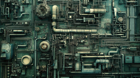 Intricate Industrial Machine System with Red Valves and Green Pipes in a Mechanical Facility Showing Complex Engineering Design AI Generative