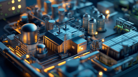 An intricate aerial view showcasing a complex industrial pipeline system featuring machinery, glowing lights, and a unique blend of blue and orange tones.