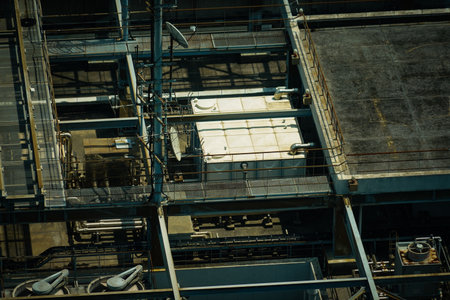 Captured from above, an industrial factory reveals its complex layout of machinery, vibrant colors, and rusty textures, showing the essence of modern manufacturing.