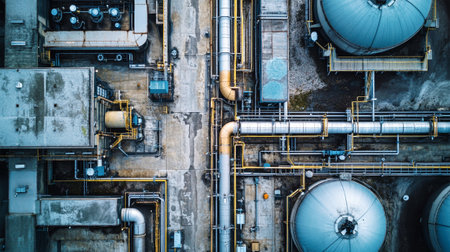 Viewed from above, an extensive network of pipes interconnects with large tanks at a cutting-edge water treatment plant, showing advanced industrial design.