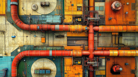 Intricate details of industrial structures showcasing pipes and metalwork in vibrant colors