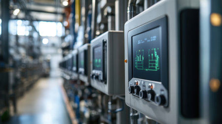 This image showcases a detailed control panel filled with graphs and diagrams in an industrial setting, highlighting automation and data monitoring capabilities.
