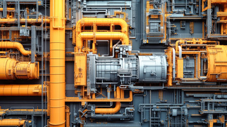 This image showcases a complex network of pipes with striking yellow accents against a dark background, perfect for design projects emphasizing industrial themes.