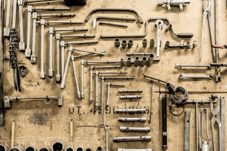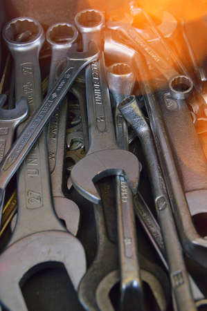 Dirty set of Wrench on a tool box/vintage background with a tools