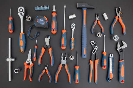 A set of tools on a gray background. top view. Space for text.