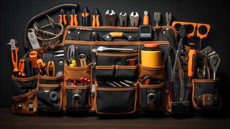 An AI generated illustration of a bag with a selection of tools on a dark background