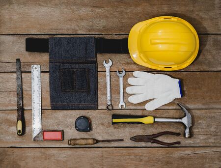 Top view of tool belt bag and old instruments constructor or renovation for build and repair house on rustic grunge wooden background