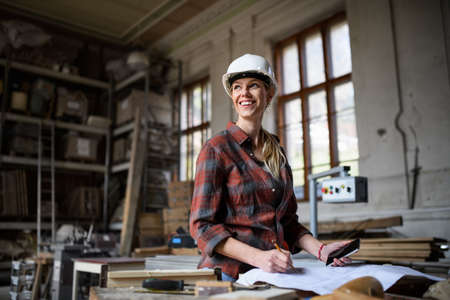 Female engineer holding blueprints and smartphone indoors in carpentry workshop.