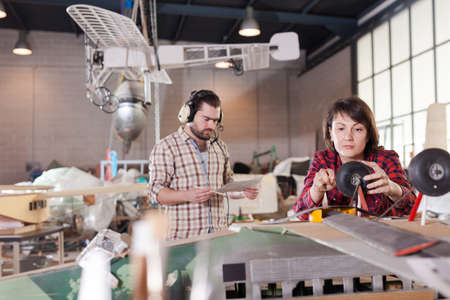 Serious concentrated young woman in workwear standing at table and watching assembly plan of watch movement