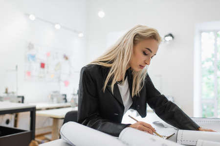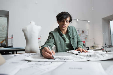 stylish fashion designer drawing on kimono near blurred sewing patterns