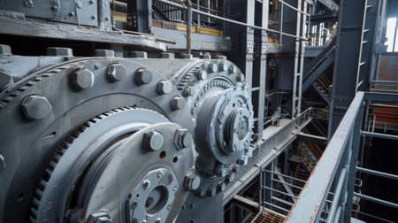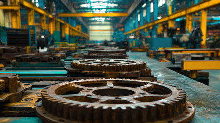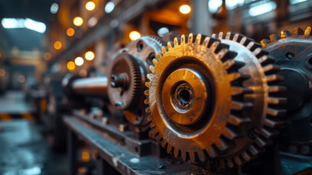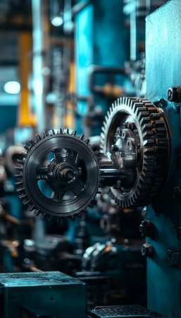 This image showcases a close-up view of industrial gears within a factory environment, highlighting the intricate details of mechanical components and engineering excellence.