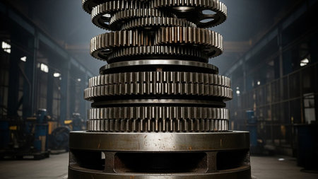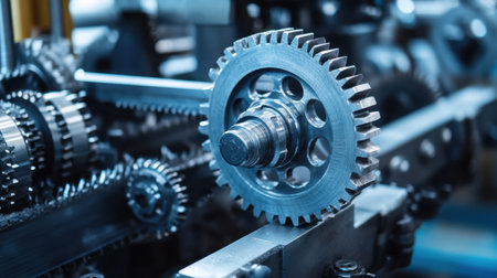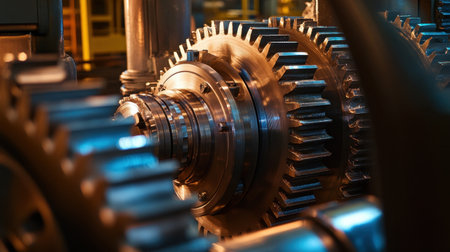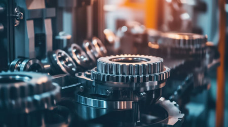 Close view of industrial gears and machinery components in a manufacturing environment. This image highlights the precision engineering involved in modern production processes.