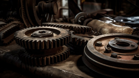 AI Generated. Rusty Gears with Orange Light Flare in Industrial Setting