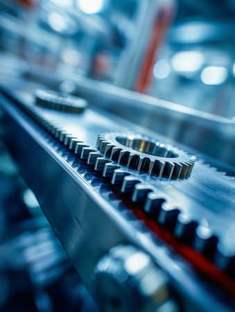 Detailed close-up image of industrial gears and machinery in an active manufacturing facility, highlighting the precision engineering and advanced technology used in production.