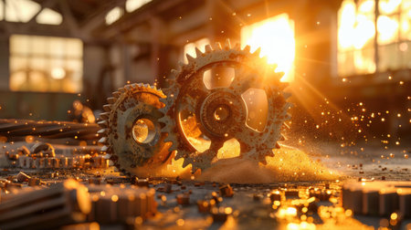 Beautiful still life featuring industrial gears set against a warm sunset glow. The scene captures intricate details, rust textures, and magical sparkles.
