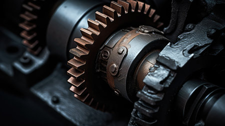 Intricate metal cogwheels reveal meticulously crafted teeth showcasing industrial engineering and precise mechanical movement.
