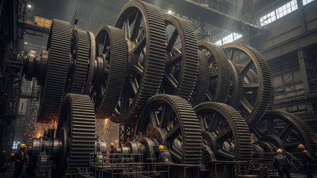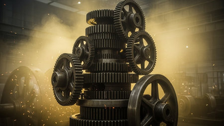 Intricate gears and machinery in an industrial setting highlighting modern engineering design