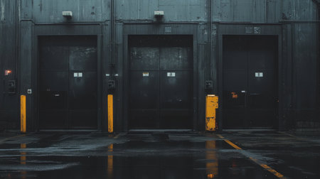 A striking image of a dark industrial warehouse featuring three closed loading doors, surrounded by reflective wet floors, creating a moody urban atmosphere.
