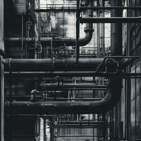 This image showcases a complex industrial pipe system featuring a detailed, monochrome design. It reflects themes of engineering and manufacturing in a modern setting.