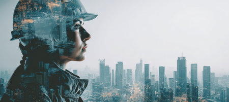 Portrait of a female construction engineer in a helmet, set against a futuristic cityscape. The image highlights the contrast between modern skyscrapers and older architecture.