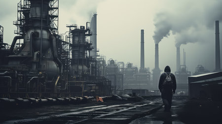 A lone worker walks through a manufacturing facility enveloped in steam and smoke, surrounded by towering structures and industrial equipment.