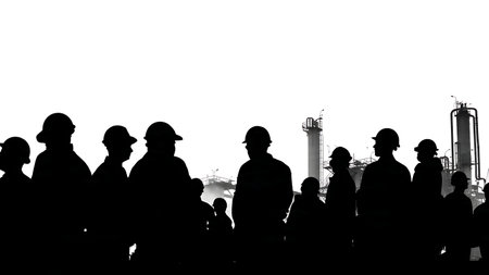 A group of construction workers in bluecollar workwear, helmets, and safety goggles gather at the site, ready to work with their personal protective equipment