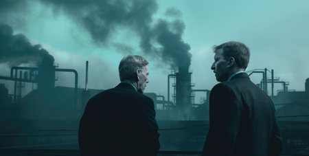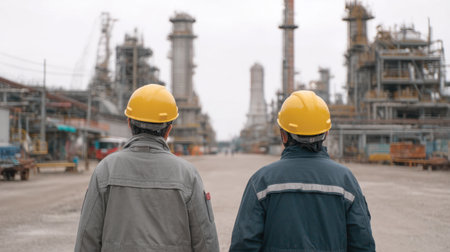 Two workers in safety helmets stand side by side, gazing at a large industrial plant under a gray sky. This image captures teamwork and professional diligence in a complex environment.