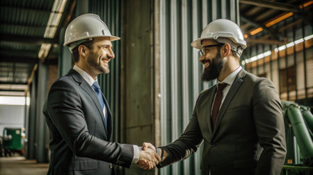 Two engineers shaking hands in warehouse. Industrial and industrial workers shaking hands.