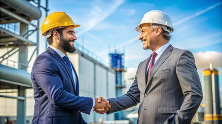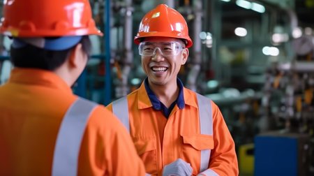 happy engineer men wearing uniform safety in factory shaking hand talking relax time working.