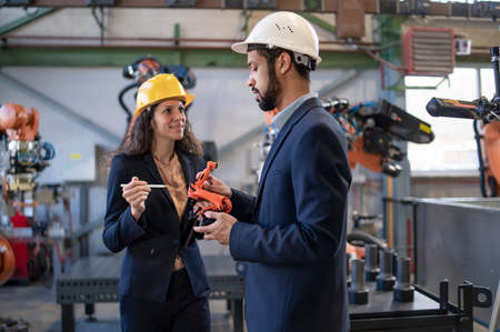 Chief engineer and project manager in modern industrial factory with robot arms talking and planning optimization of production.