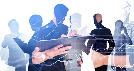 Group of business people work together using smartphone and clipboard with documents. New York city skyscraper in background. Financial chart and graph in foreground. Concept of teamwork