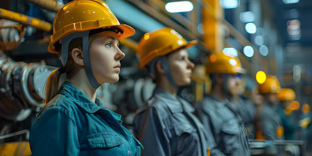 Shift Change at a Factory: Workers in Helmets and Uniforms in an Industrial Setting. Concept Industrial Photography, Factory Workers, Shift Change, Protective Gear, Industrial Setting