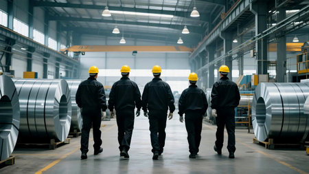 Factory workers in protective uniforms and helmets walk through a modern steel manufacturing plant. Industrial setting with steel rolls, machines, and structured lighting environment
